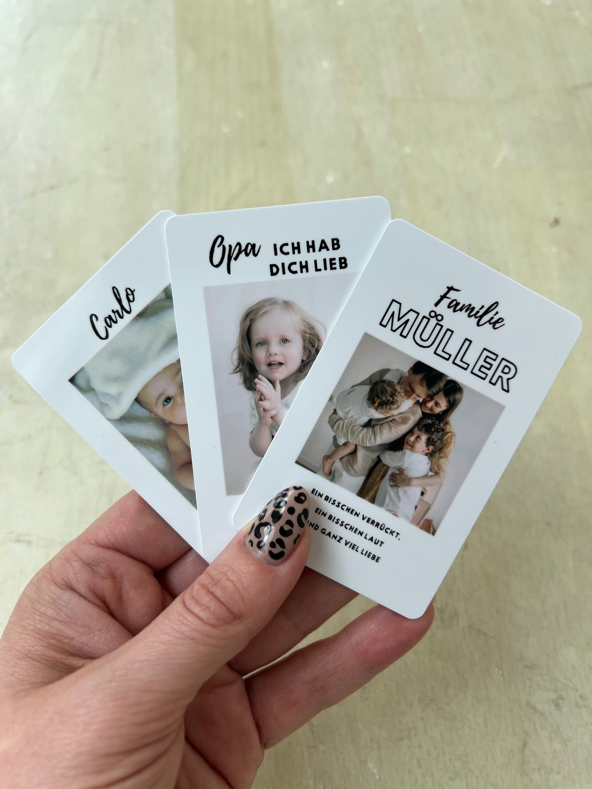 Entdecken Sie unsere Fotokarten aus hochwertigem Plastik, die perfekt in Ihren Geldbeutel passen! Personalisieren Sie Ihre Karten mit einem Wunschfoto und Namen um sie einzigartig zu gestalten.