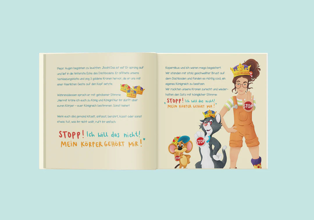 Gemeinsam finden die drei heraus: Wir dürfen immer selbst bestimmen, ob wir gekitzelt, angefasst oder geküsst werden wollen. Unser Körper gehört nämlich allein uns selbst und ist sowas wie unser Königreich! Doch was das Ganze mit guten und schlechten Geheimnissen und einer festlichen Krönungszeremonie zu tun?