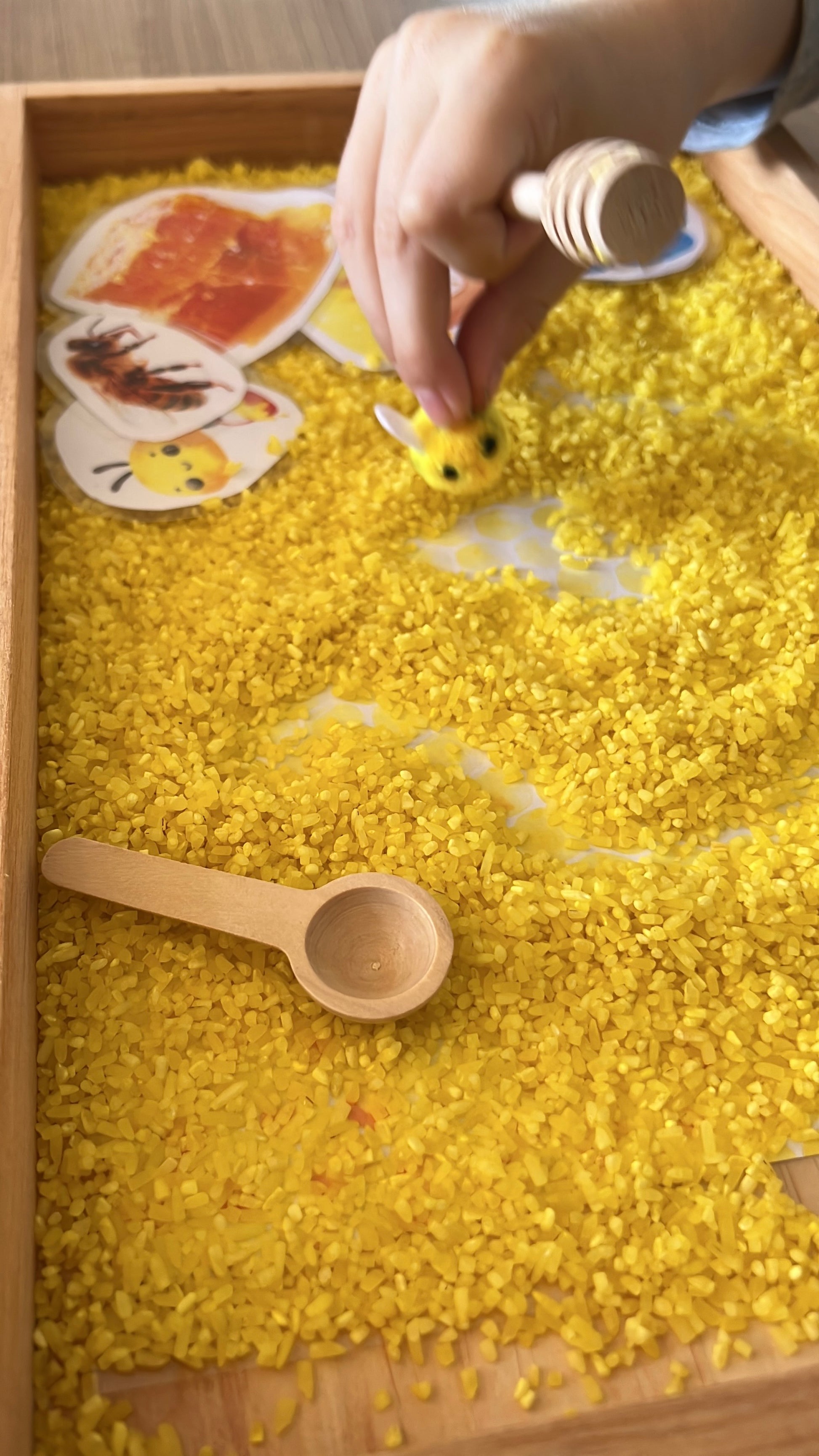 Unser Mini-Sensorikset „Honigbiene“ bringt Kinderaugen zum Strahlen: Der goldgelbe Reis mit Glitzer und feinem Honigduft lädt zum Fühlen, Rühren und Entdecken ein. Gemeinsam mit der süßen Filzbiene, dem Honig-Dipper und dem kleinen Holzlöffel entstehen kreative Rollenspiele und spannende Sinneserfahrungen.