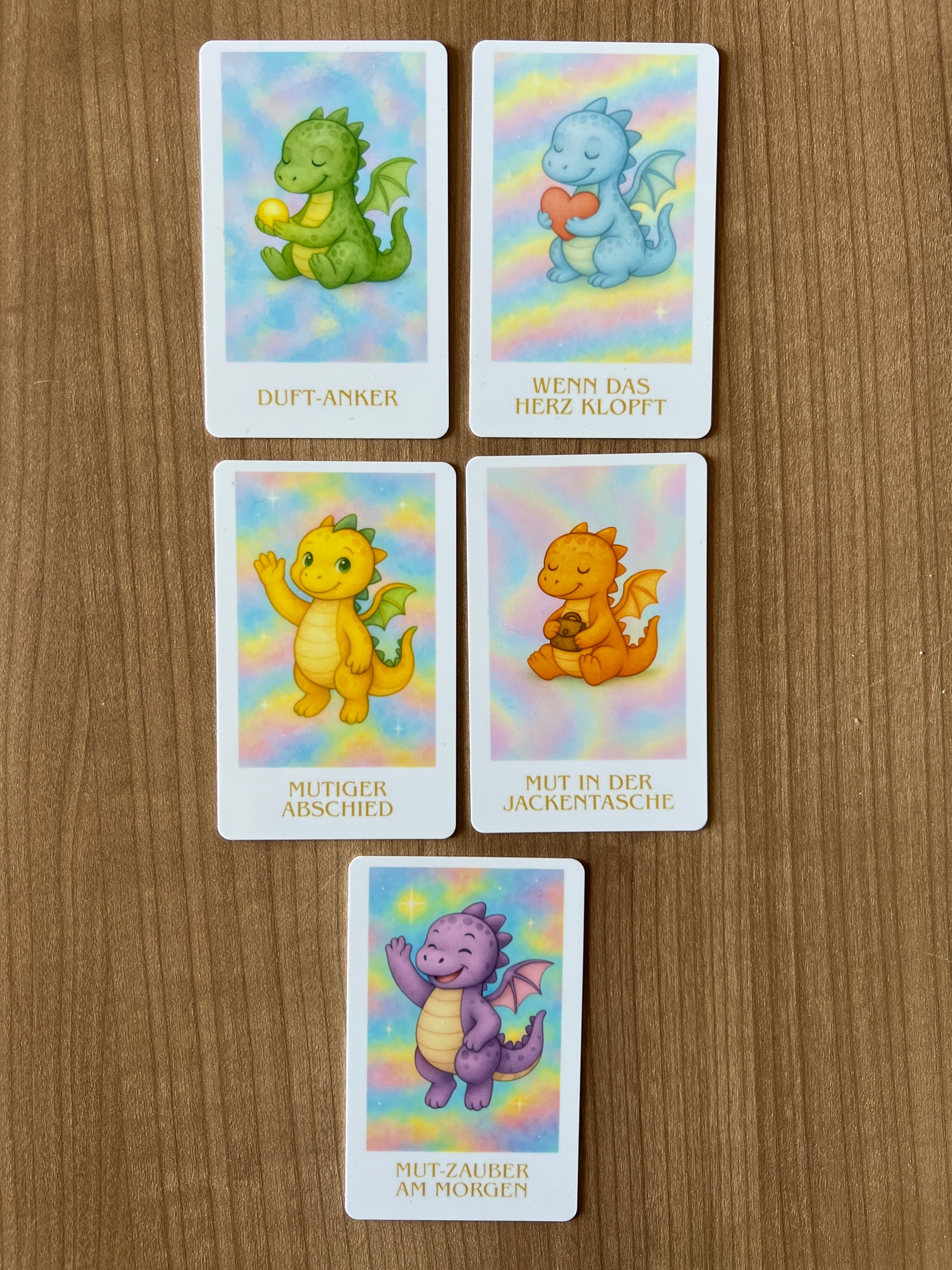 Jede Karte begleitet euch mit einer kleinen Fantasiereise, einem einfachen Duft-Ritual und einem stärkenden Mut-Spruch. Dein Kind wird spielerisch ermutigt, in sich hinein zu spüren und Vertrauen zu finden – mit Hilfe seines eigenen Drachenfreundes.